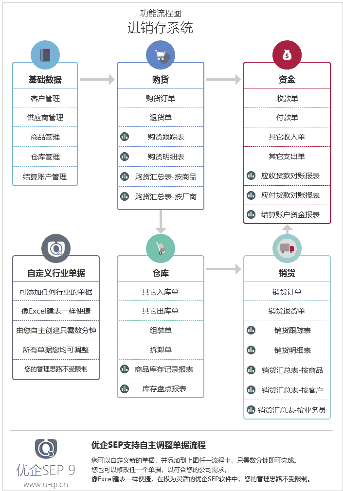 企格倉庫進銷存軟件一站式管理企業(yè)的出入庫、進貨、銷貨、庫存、資金。支持商品的組裝和拆卸業(yè)務(wù),詳細記錄商品的應(yīng)收、應(yīng)付款,并自動統(tǒng)計未結(jié)款項,通過企格管理軟件,讓您全面、實時了解商品的進銷存情況。